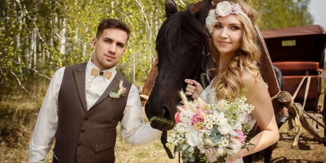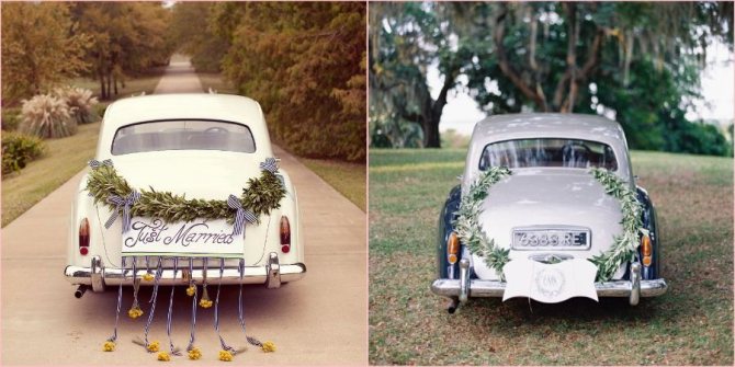 Здесь есть два варианта, первый – старинное авто, которое можно украсить цветами, растениями и даже ветками от деревьев. Или более оригинальный – это лошади с повозкой, в которую можно положить сено.