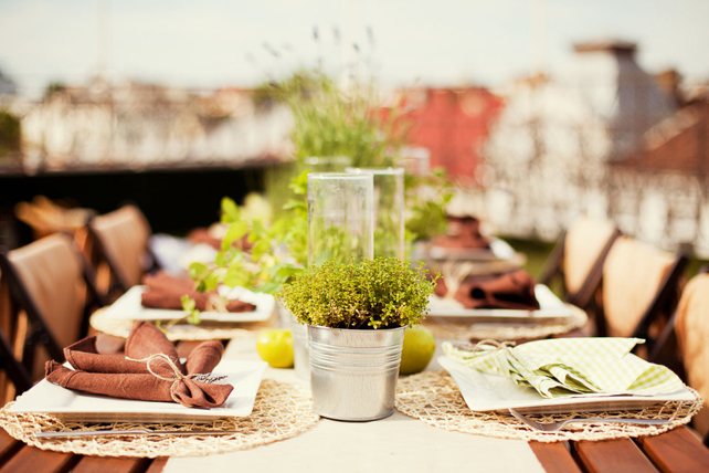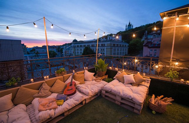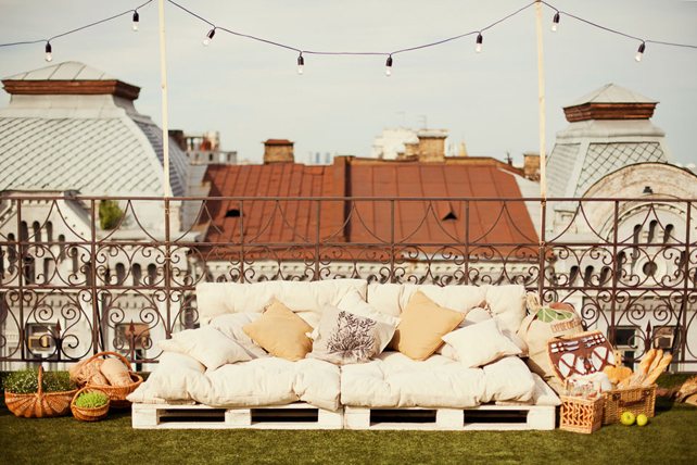 Важно позаботиться о декоре и комфорте гостей. Мягкие диванчики не так просто вытащить на крышу, поэтому их лучше заменить на кресла-мешки или подушки. В вечернее время вам понадобится дополнительное освещение. На помощь придут гирлянды с лампочками и свечи в высоких стеклянных подсвечниках. Накрыть стол можно на скатерти, расстеленной прямо на полу. Принесите с собой стеклянную посуду, потому что лёгкая одноразовая посуда может доставить вам массу неудобств при сильном ветре.