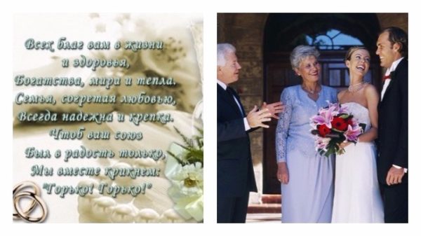 - «Дорогие наши, (имя невесты и жениха)! Никогда не унывайте в этой жизни, потому что уныние приводит к равнодушию, а у вас впереди лежит еще долгая и, будем надеяться, интересная жизнь. Помните, что вы сами создаете свое будущее, поэтому не бойтесь пробовать, творить, созидать и вдохновляться присутствием друг друга! То, что мы сегодня наблюдаем, как рождается новая ячейка общества, для нас уже является огромной радостью. Поэтому никогда не теряйте взаимопонимания и наслаждайтесь обществом друг друга как можно дольше!»